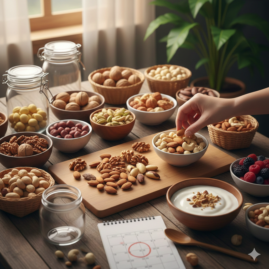 견과류는 아침 식사 대용이나 식사 사이에 간식으로 먹었을 때 혈당 수치를 안정적으로 유지하는 데 도움을 줍니다.