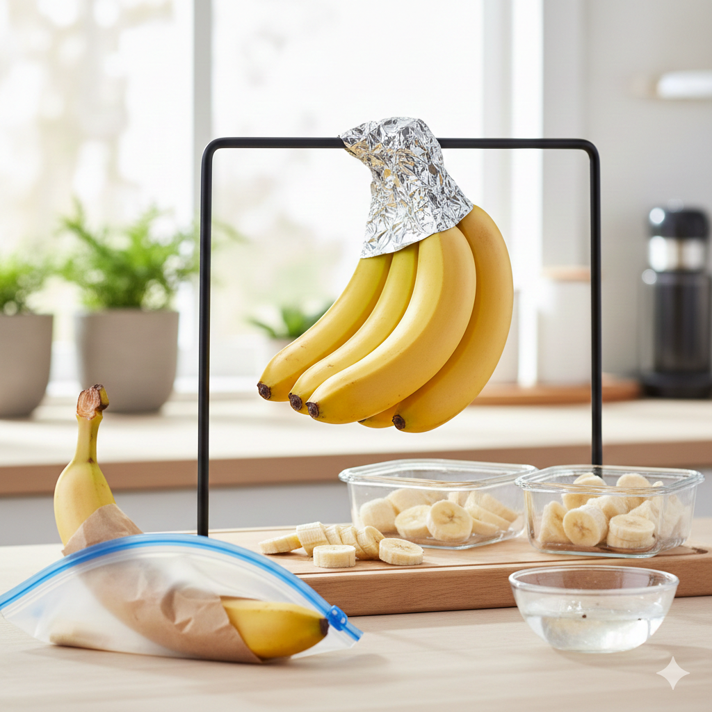 바나나 송이의 윗부분인 꼭지 부분을 랩이나 알루미늄 호일을 사용하여 공기가 통하지 않게 꼼꼼하게 감싸주는 것이 핵심적인 방법입니다.